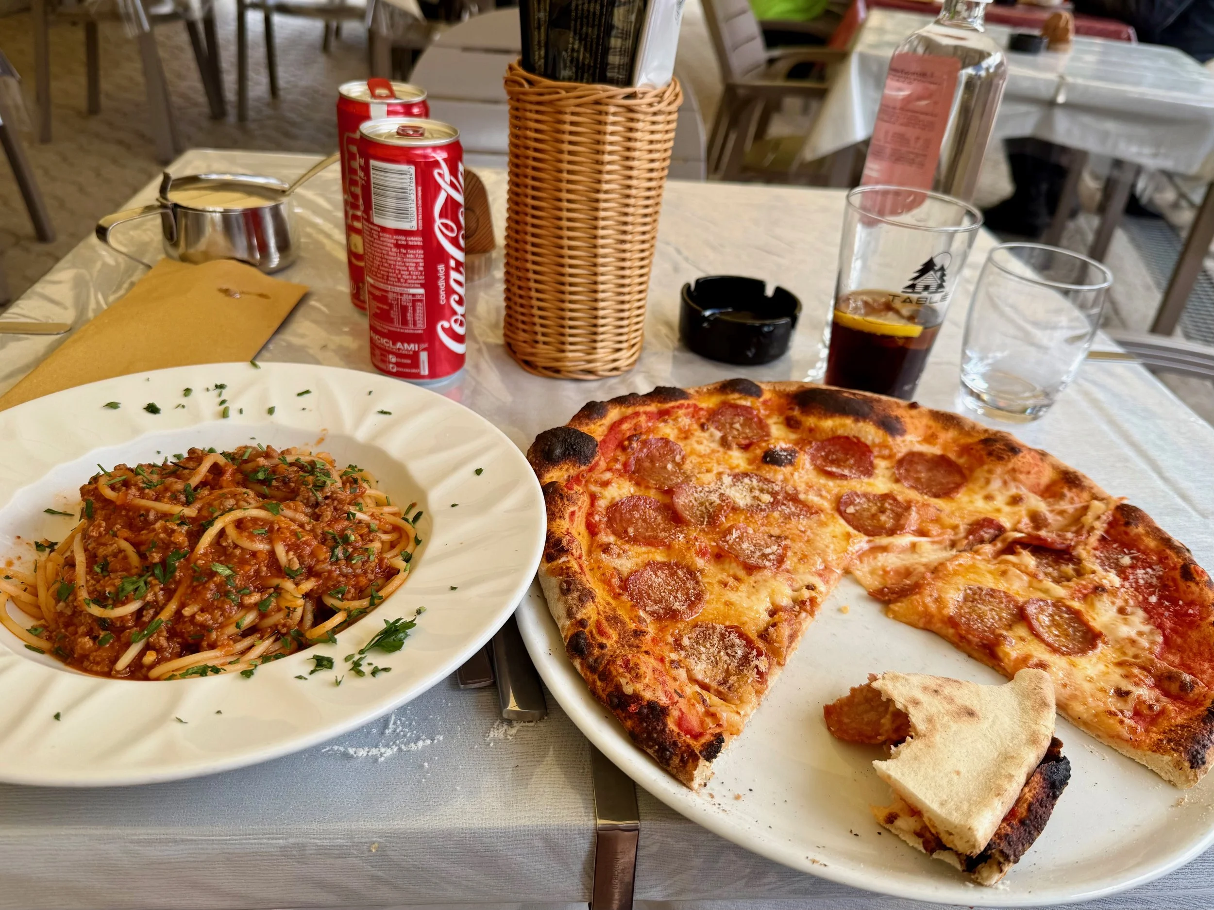 From the valley, I followed a sign pointing North for Passo Pordoi and began a long arc to get to Arabba where I planned to stop for lunch. This section packed more of a punch in terms of climbing than I was expecting, including a number of switchbacks. By the time I made it to Arabba, I’d done 55 miles and 9,500 feet of climbing. Lunch was sorely needed. My waitress looked at me funny after I ordered a pizza diavola, two Cokes, and water, asking “is that all?” in a tone that implied I looked like I needed more. So I added spaghetti bolognese. It was an absurd amount of food, but I finished almost all of it.