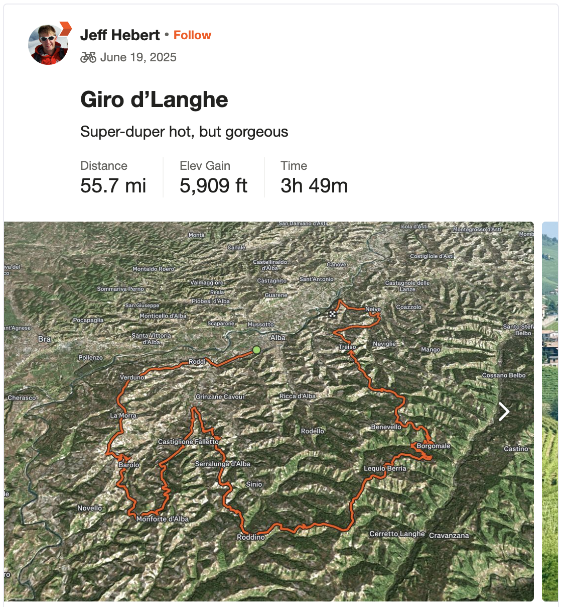 I rolled into our spot in Barbaresco a bit under 4 hours after I’d started and was absolutely shellacked. I laid down on the floor under our air conditioning for a good while, waiting for my heart rate to come back down. Too bad the heat made this otherwise spectacular ride not as enjoyable as it could have been. Regardless, it was wonderful to get out there once again.