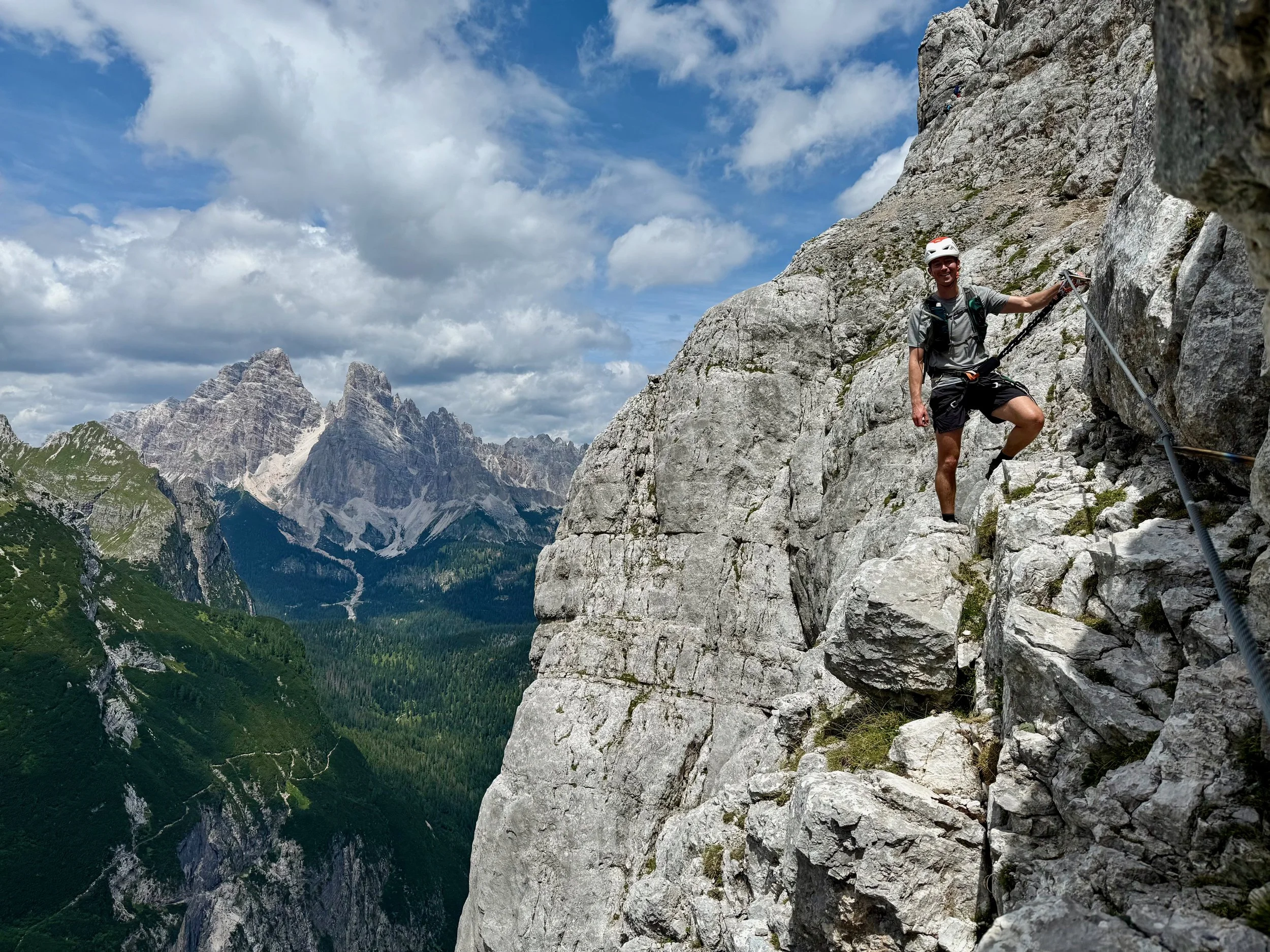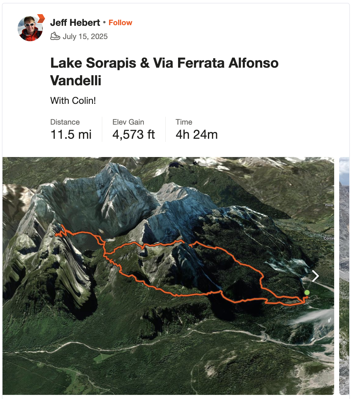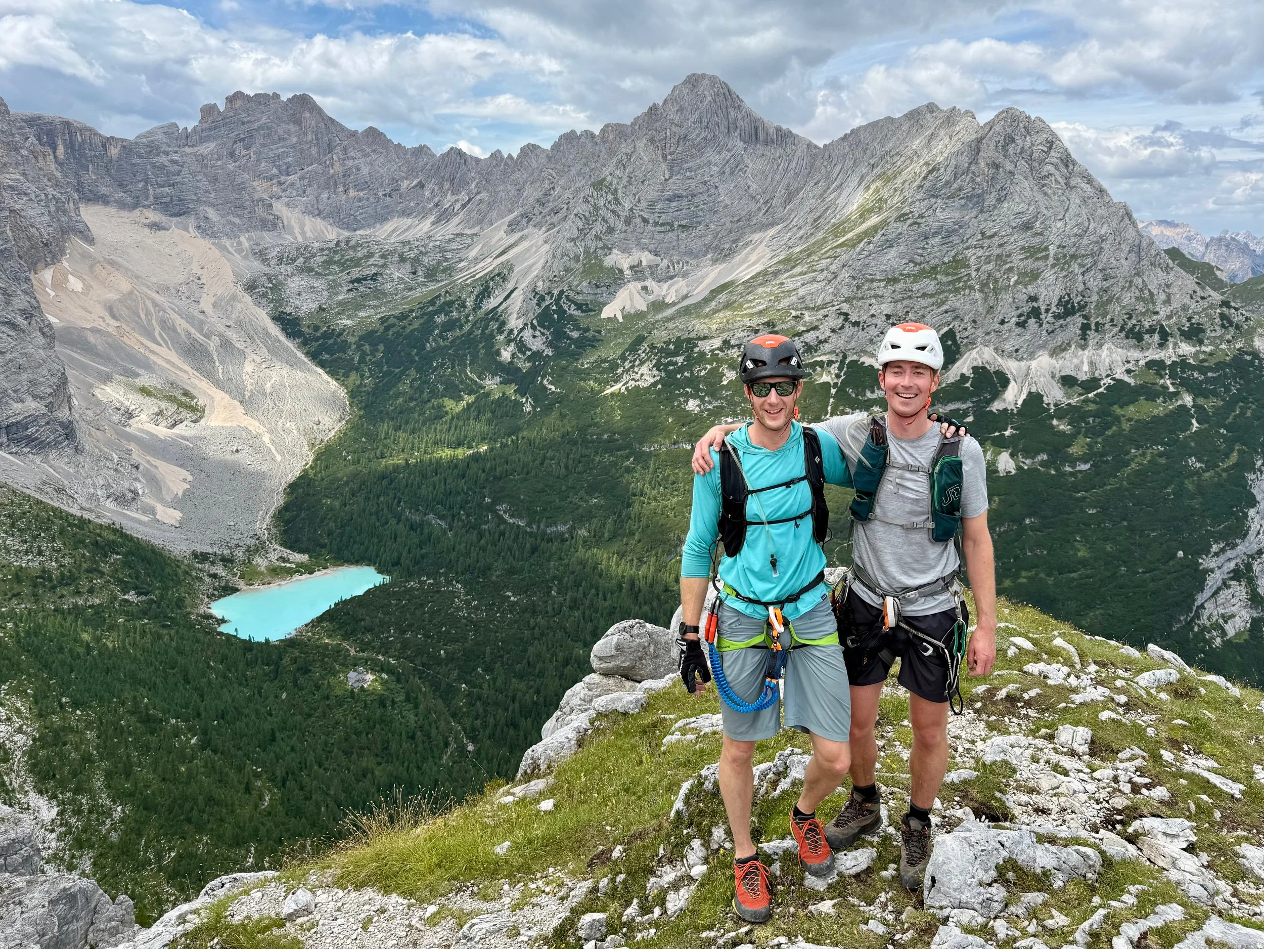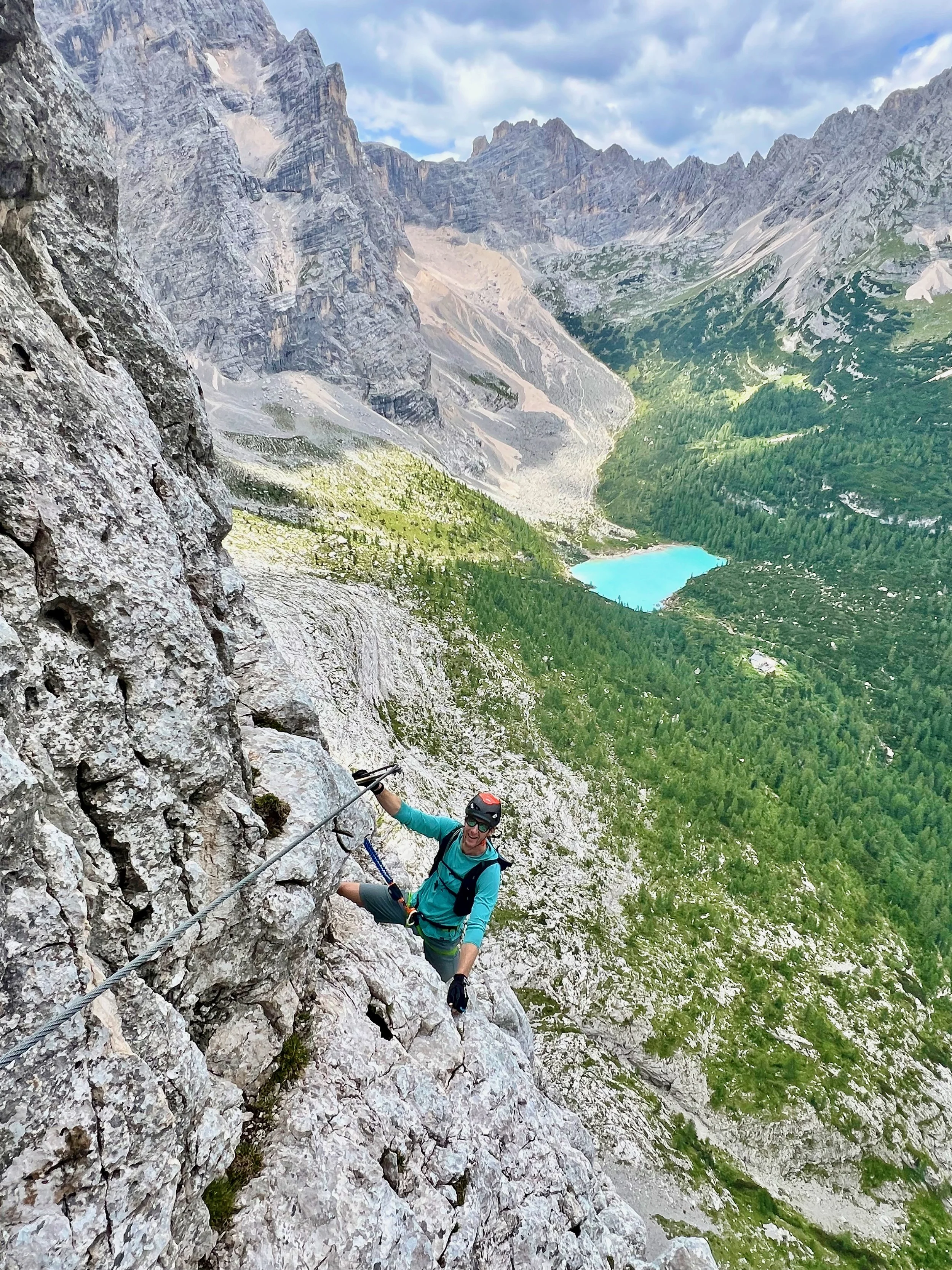 Colin, Jen, Erica, and I arranged babysitters for our kids on the same day so we could all get out together in the mountains near Cortina. After some searching and discussion, we decided to head up to Lake Sorapis, with me and Colin bringing via ferrata gear to do whatever portion of the Giro del Sorapis we could with the time we had.