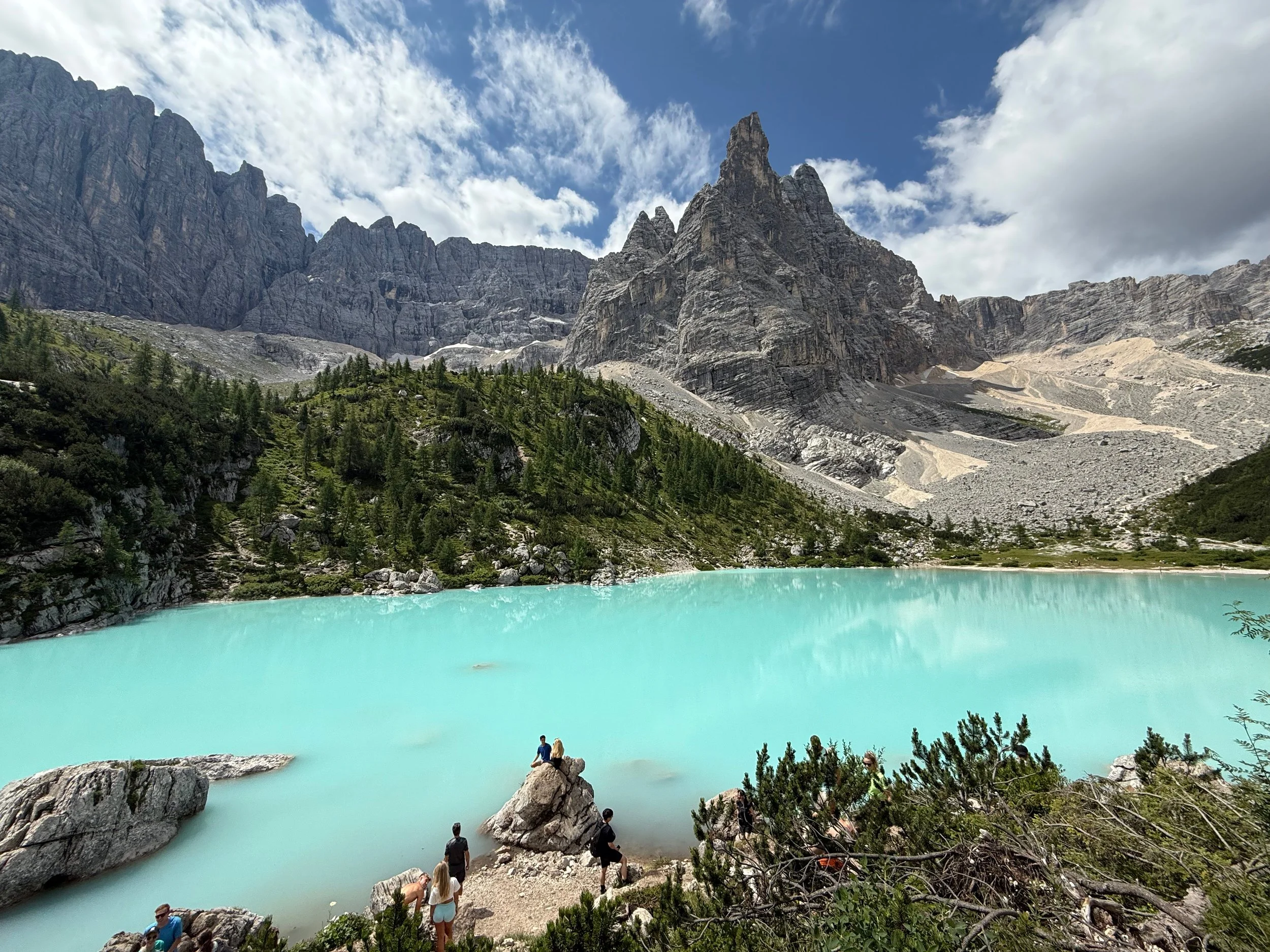 Instagram must have made Lake Sorapis famous because the parking and the trail were absolutely mobbed a little before 10am when we arrived after handing off our kids. There was an order of magnitude or two more people heading here compared to everything else we’d done in the Dolomites nearby so far. After a faster, wider trail for a while, the higher trial has enough rocky sections with drop-offs on the side that people were limited by the slowest folks and rarely able to pass. We scooted around folks where we could and otherwise resigned ourselves to moving much more slowly than we would have liked and having less time to explore up there. Oh well. We were adding to the crowds, too.