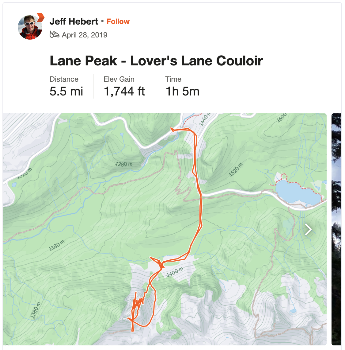 With some colder weather, consolidated spring snow following a warm spell, and a short weather window, I talked Colin into heading down to Rainier and getting on one of the couloirs of Lane Peak. When we got to the Narada Falls parking lot on Sunday morning at about 9:15am, I scoped out the face with some binoculars and it seemed like Lover’s Lane would go.