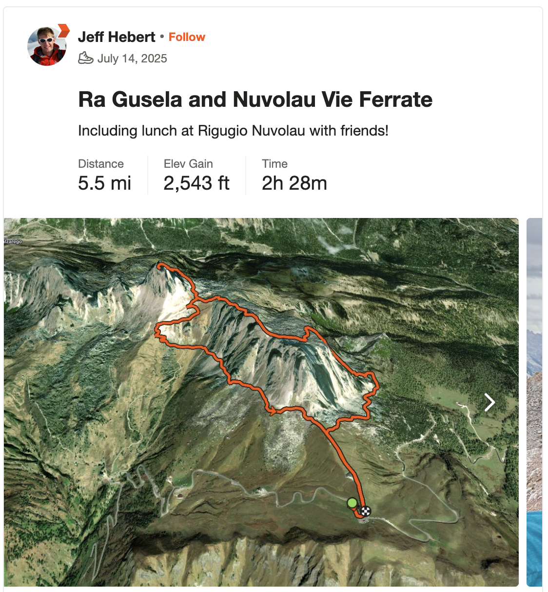 After lunch, Erica and I descended to the saddle and then went up the Averau via ferrata. The skies were increasingly threatening at this point and we were prepared to turn around at any moment if it started pouring, but we pressed on and thankfully were able to complete the route quickly up and down. There are just a handful of steeper moves on this route and a short amount of cable during this section. Just as we got back to the saddle, the skies opened up. Thankfully, the hike back to Passo Giau was straightforward and the only problem was that we got wet. Worth it!