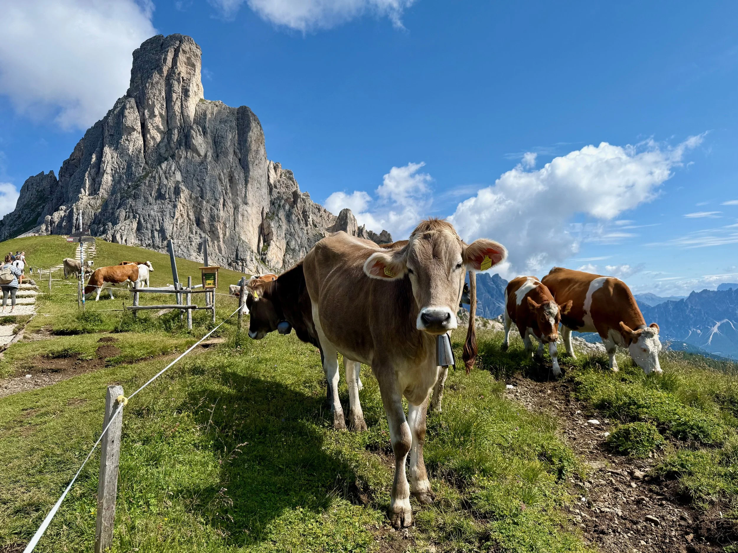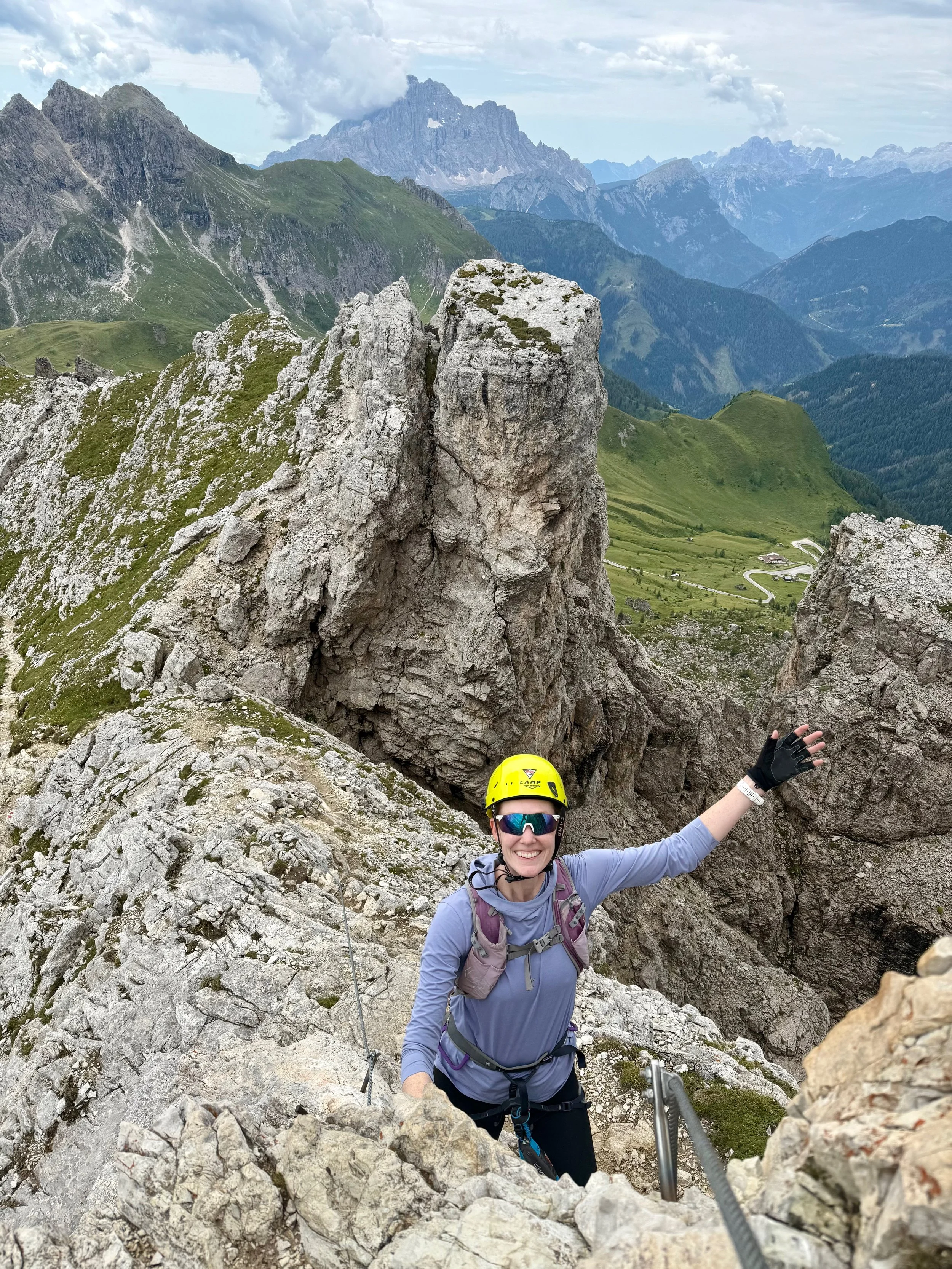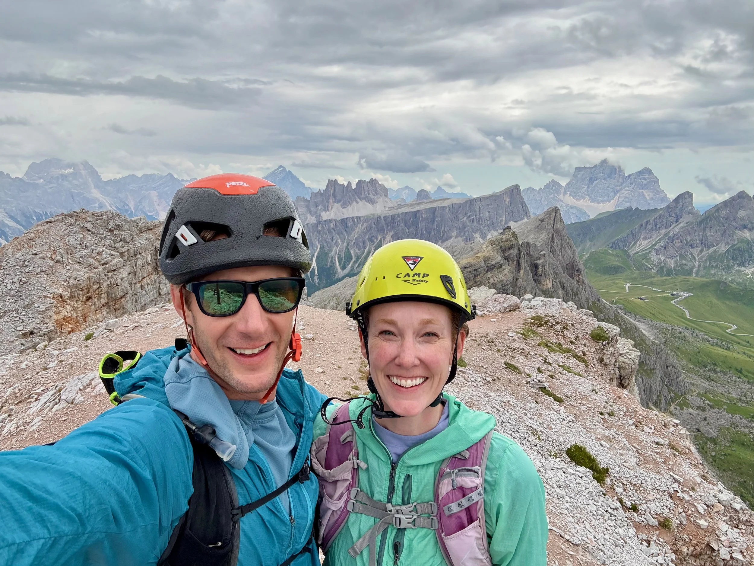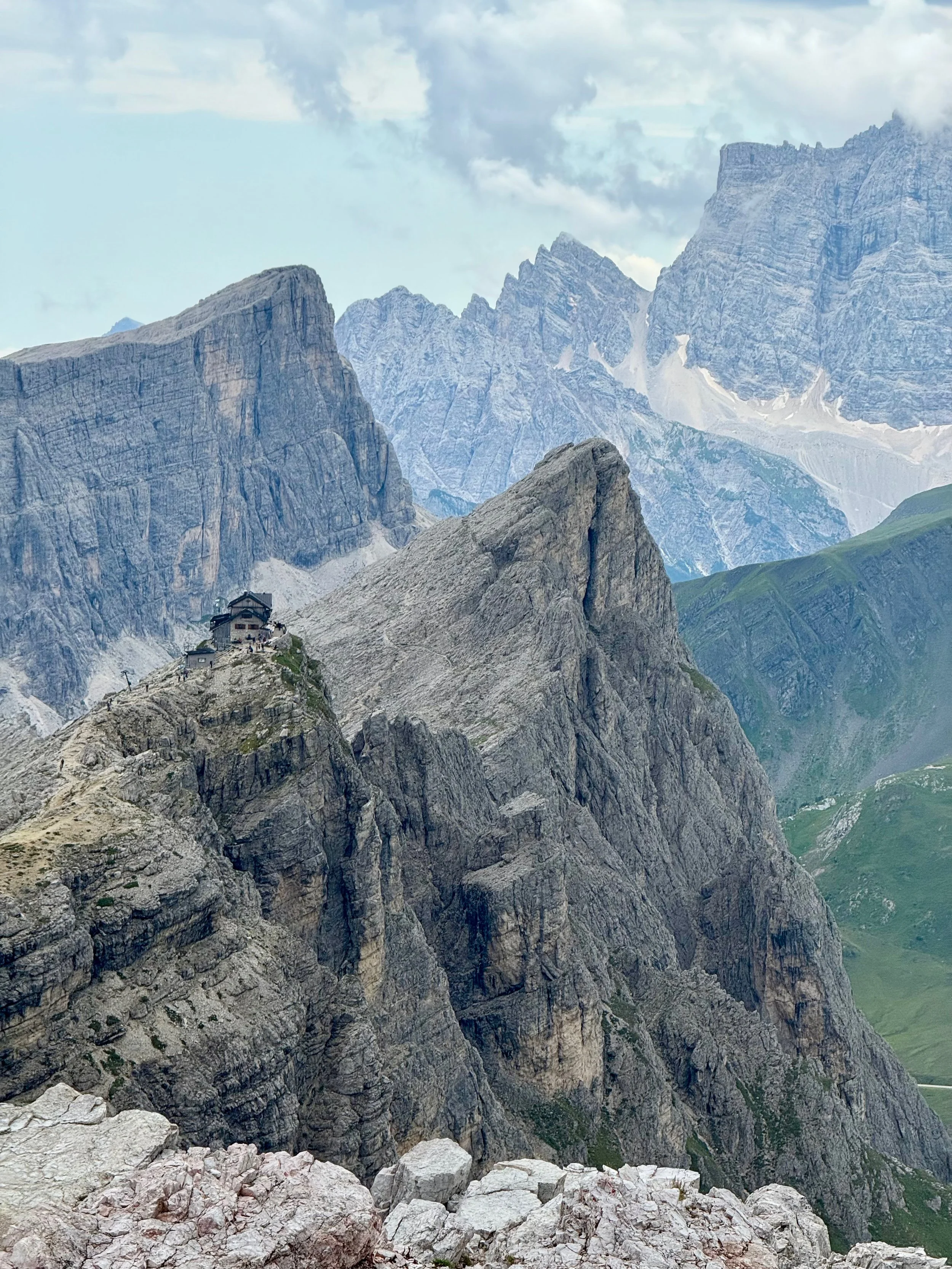 With our friends Jen and Colin and their kiddo arriving in Cortina to overlap with us for a week and a babysitter arranged for the day for only us, we hatched a plan to rendezvous with them at Rifugio Nuvolau. They rode the Cinque Torre lift and hiked up while we drove to Passo Giau and climbed up the Ra Gusela via ferrata. It turned out this route was very simple and easy with very little need to clip in, so we were a bit ahead of schedule and were able to snag a table for lunch. What an improbable location for a hut with views in all directions. Thankfully the weather cooperated and it was reasonably warm to eat outside.