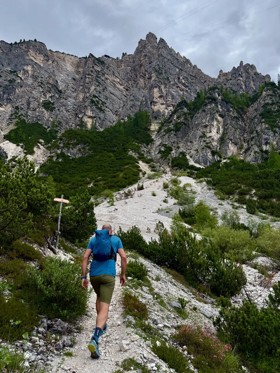 On our last full day together, Eric, Owen, and I were all given the hall passes from our wives to get out together for a few hours during the afternoon. We decided to do the Sci Club 18 route just above town as quick as we could despite the Faloria cable car being closed for the season. I jogged from our house down the bike path and met them at the street heading up the hill toward the route where we met up and kept running uphill toward the route. At about 45 minutes from home, we reached the base of the route sweaty and out of breath. Just then, a few rain drops started falling on us and we debated if we should press on or bail. The forecast had suggested rain later on, so we chanced it.
