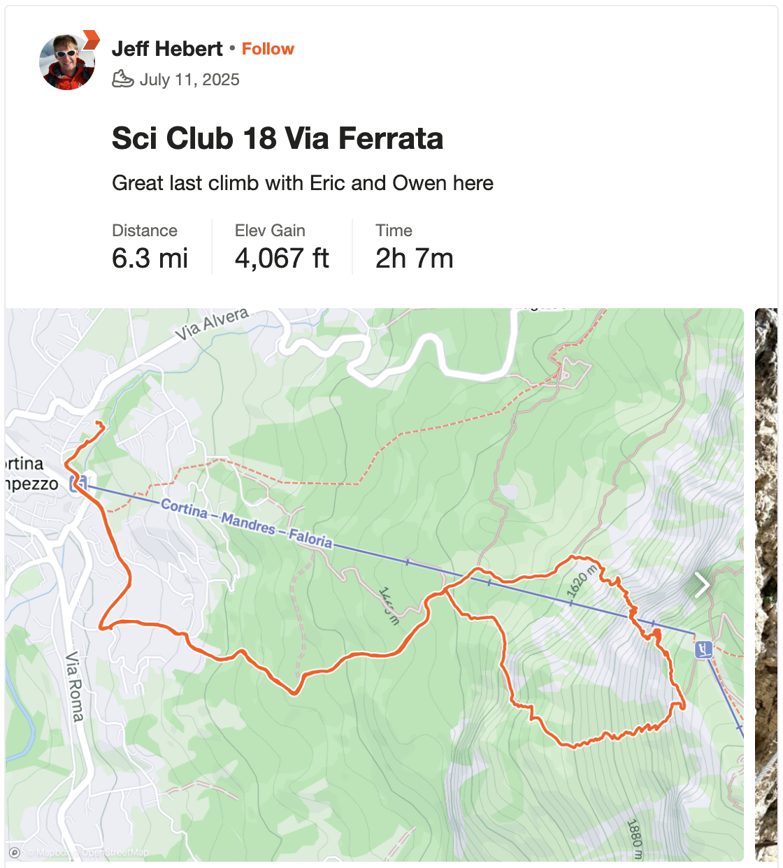 After a brief moment together at the end of the route, we packed up our gear and started jogging down. We quickly reached the “Cliffhanger Hut” with a sign saying “Stallone was here in 1993,” which was pretty cool. The descent was otherwise not so cool—mostly just a bunch of knee creaking without views, but it went pretty fast. I dropped the guys at their house and jogged back to mine, finishing a little over 3.5 hours later.