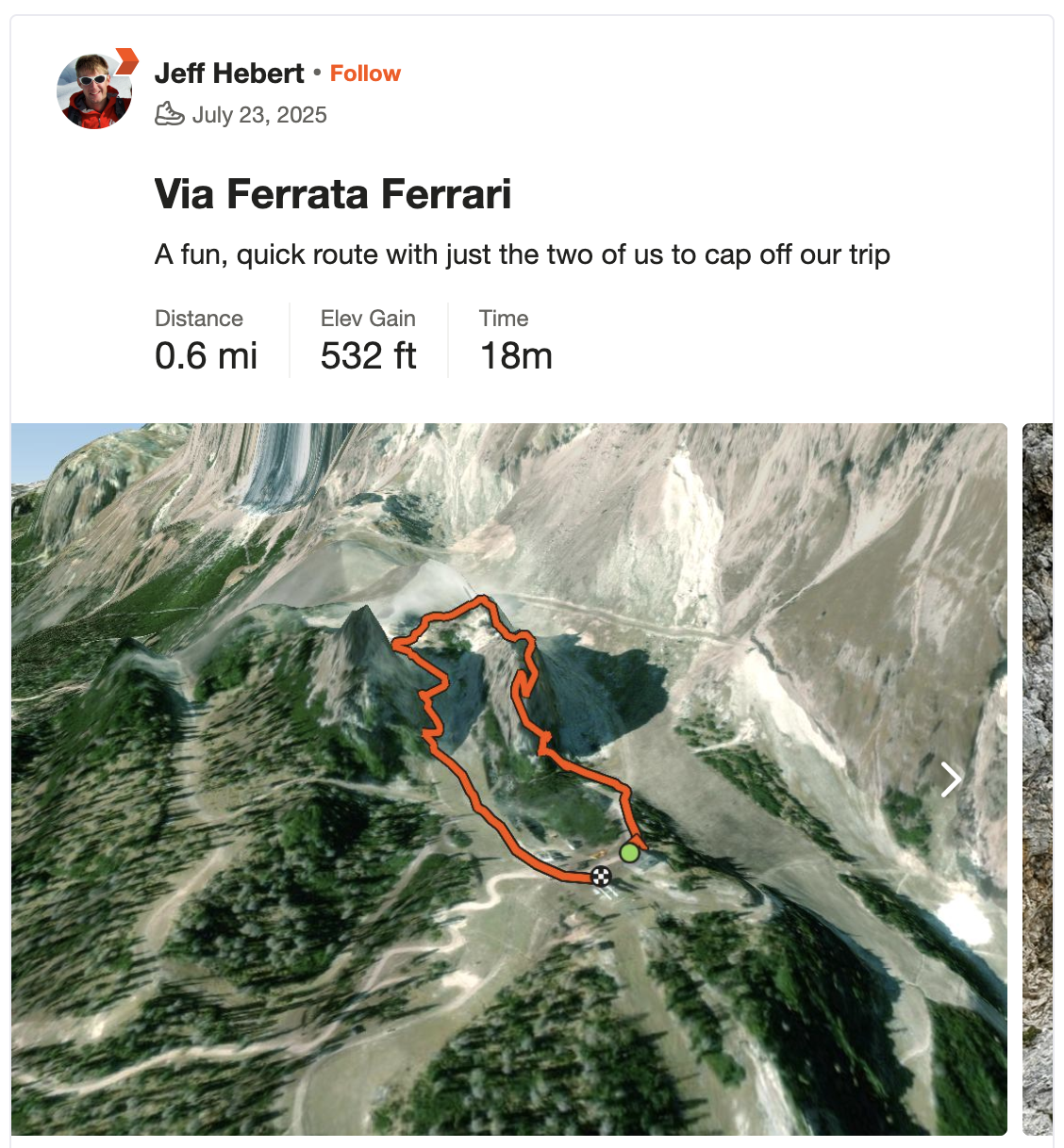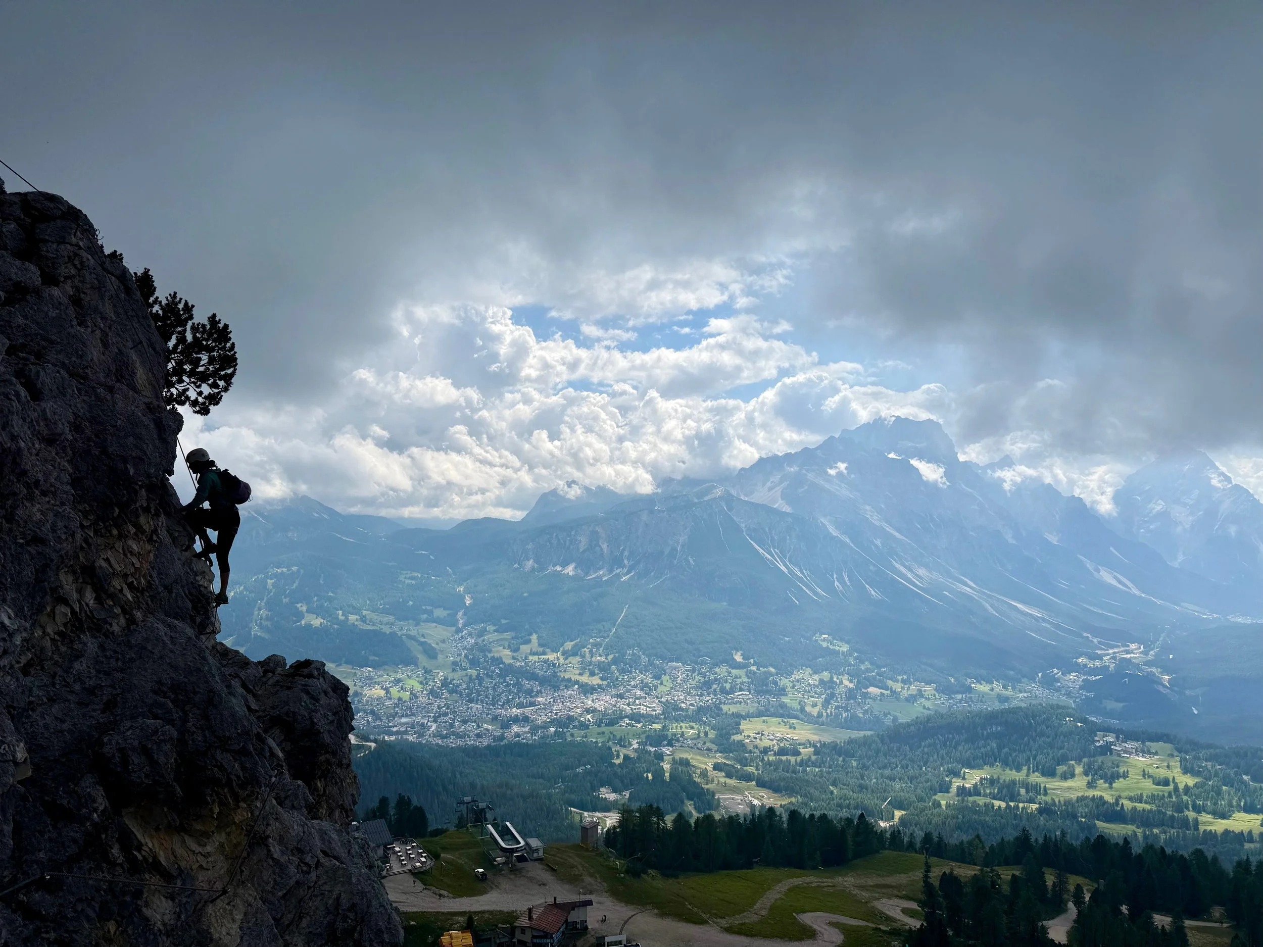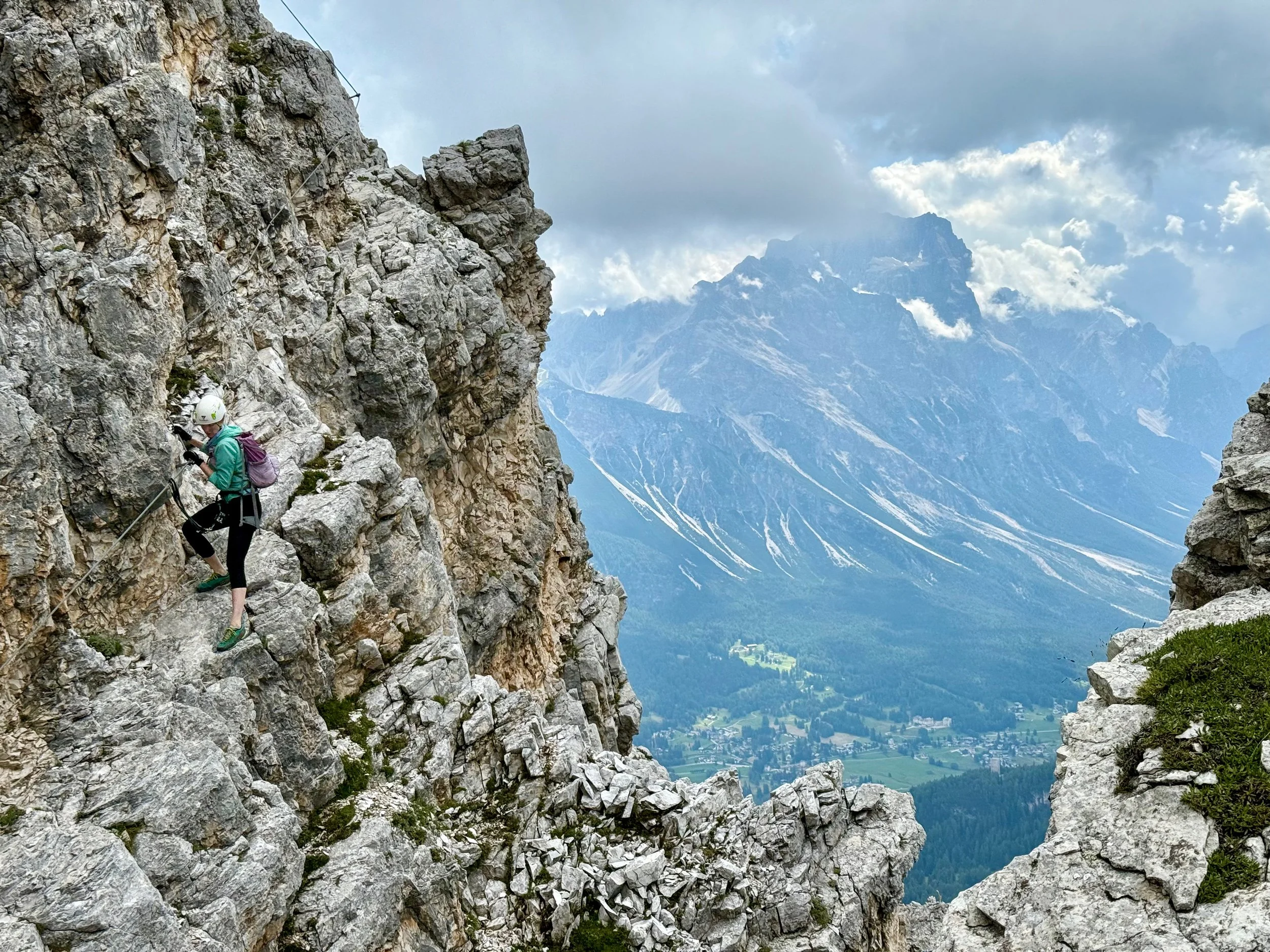 For our last adventure together in the Dolomites on our parental leave trip, enabled by a babysitter, Erica and I got out for a short but fun via ferrata route in the Tofana area. Accessed by a chairlift from Pie Tofana, the climbing to hiking ratio was high. The route was pretty fun and reasonably steep, meandering up the East face of a rock outcropping near the Pomedes Hut. It had a couple of fun bridges and some great views looking East toward the Cristallo.