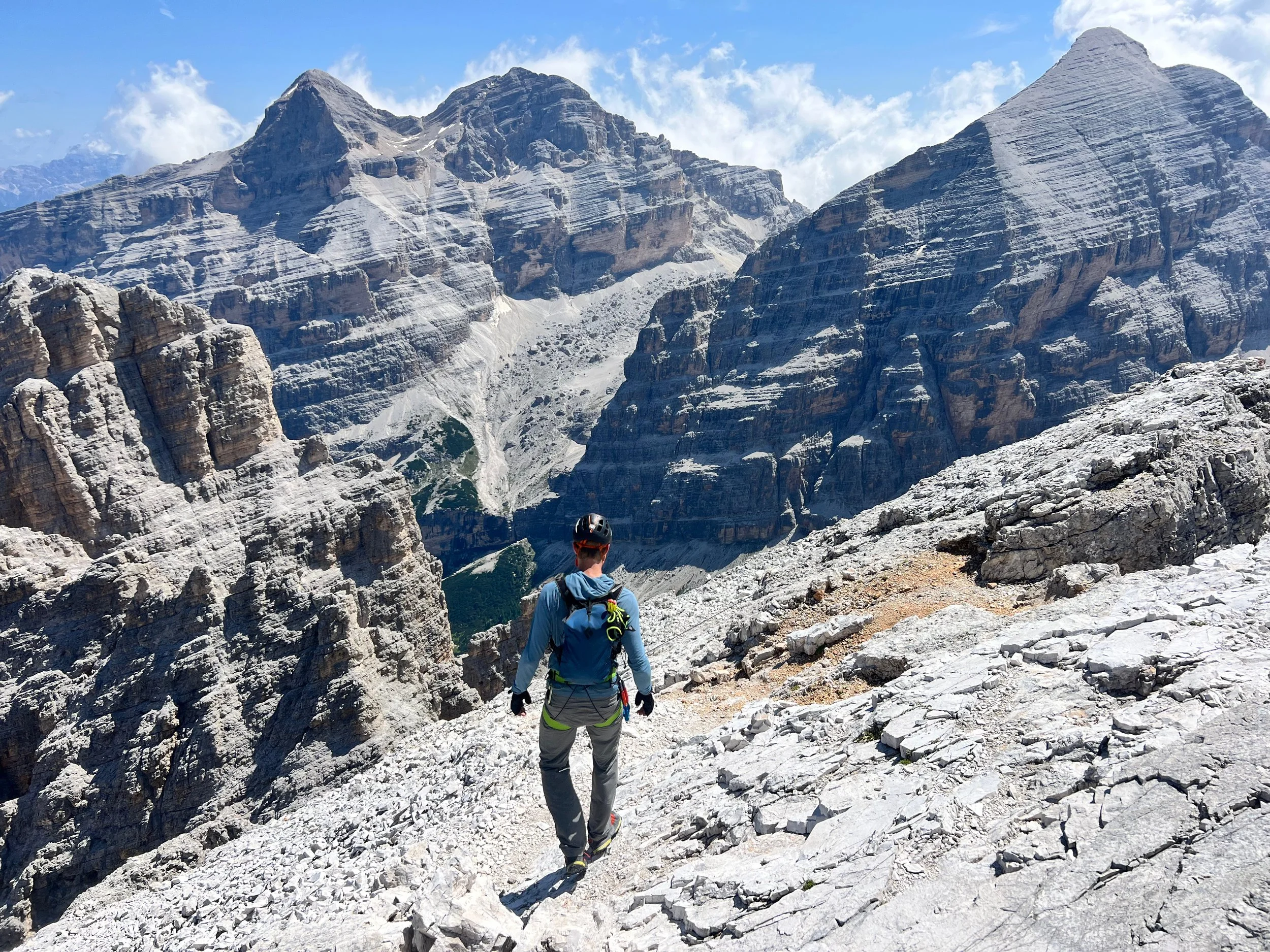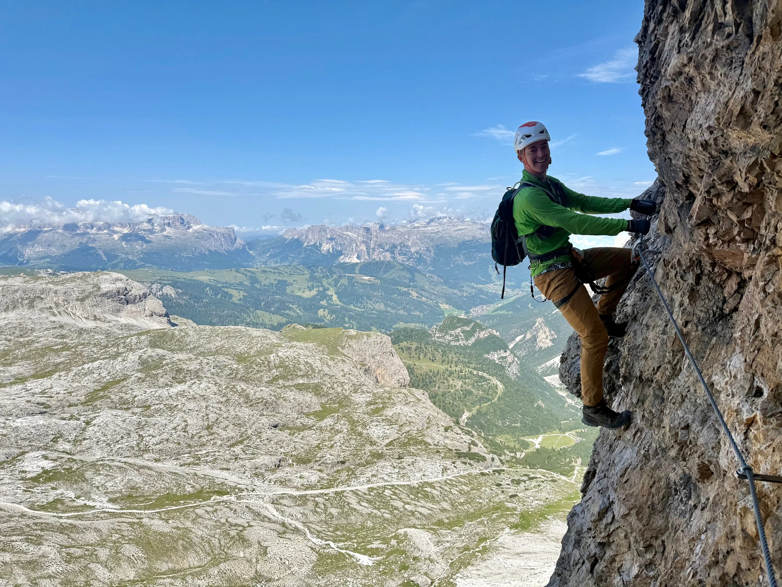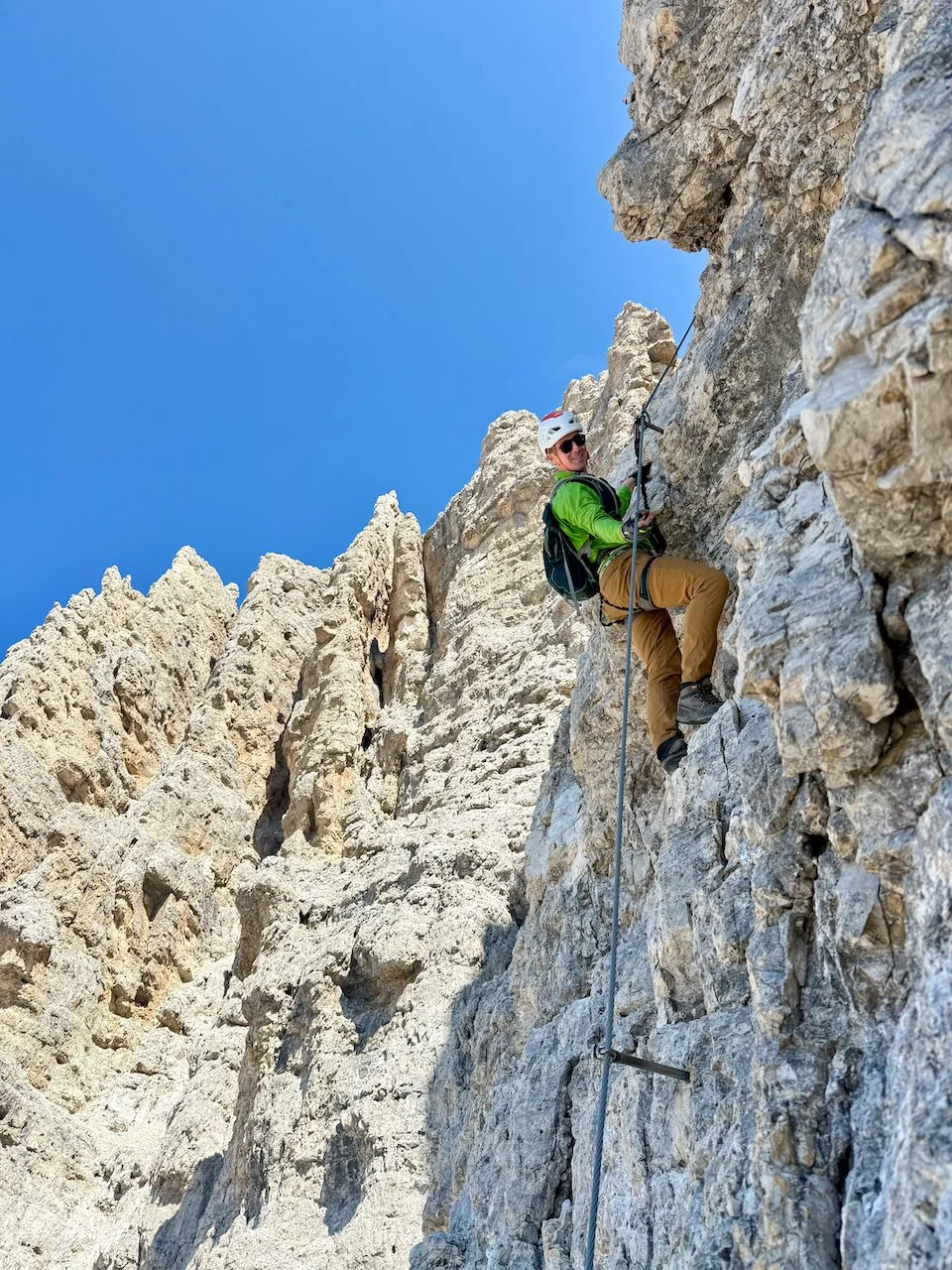 The very beginning of the route is reasonably steep as it traverses leftwards with a few fun moves before turning up the face and easing off pretty quickly. We enjoyed this bit and hoped that it wouldn’t be the only technical challenge of the route. The next sections were still fun even if easier and eventually brought us to a ledge where our route stayed right. From a prow, the final section of the route steepened back up nicely and we had a lot of fun from here through the summit, climbing as much as we could on the rock and ignoring the cable other than for clipping ourselves in. There’s an especially fun dihedral near the top and then an exposed slab making up the last section of the route.