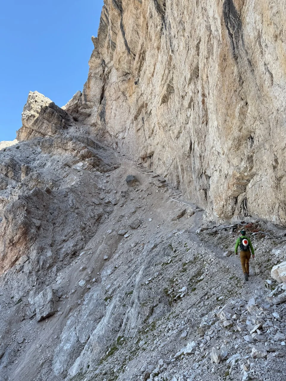 We rode the cable car up to the Lagazoui Hut, setting off from there down the busy trail at 10am. The approach wove steeply up towards the route with a switchback just before the saddle where the trail cuts through and the route splits off. We were at the plaque, geared up and starting to move just before 11am.