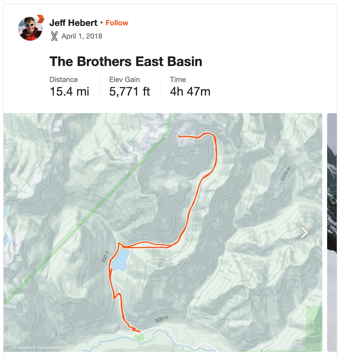 From my apartment in Seattle, The Brothers are a prominent landmark on the Westerly horizon.  During clear days in the winter and spring, the snowy East Basin looks like an alpine playground, so I just had to check it out.