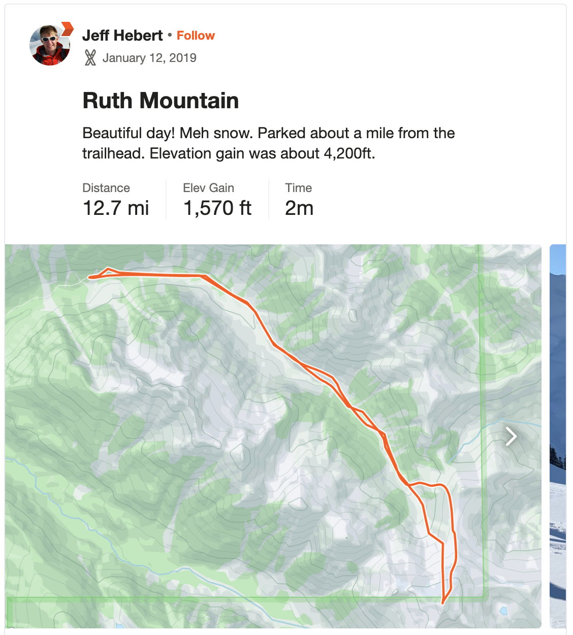 With a promising weekend forecast and a substantially-lower avalanche forecast than much of the winter so far, Kelsey and I hatched a plan to ski Ruth Mountain on Saturday as a day trip from Seattle. We knew the ski conditions wouldn’t be great, but the views would make up for it. We left town early and were able to drive most of the forest road, parking a little over a mile from the trailhead where the snow got too deep and a tree blocked the road. Another car of 3 guys had just parked before we rolled up and we ended up spending most of our day together.