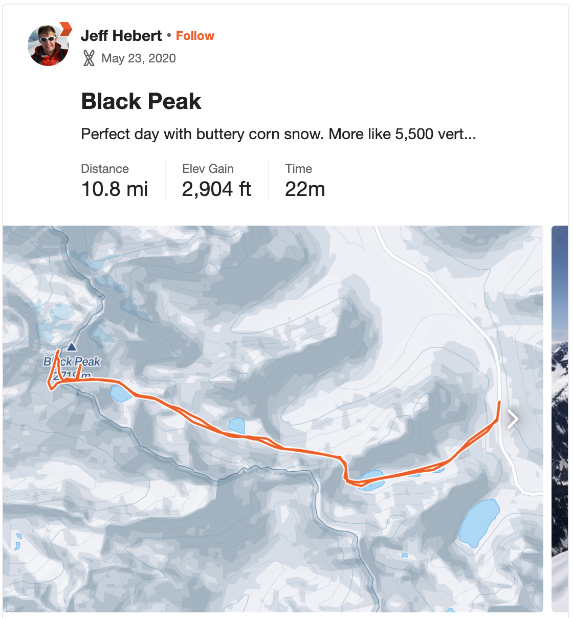 The rest of the tour went fine, with more phenomenal buttery corn skiing, and we made it back to the car about 7 hours after we’d started. So good to be back out. While there were a lot of people doing the route, it didn’t feel absurdly crowded and we had some good moments to ourselves. Just shy of 11 miles with about 5,500 feet of climbing.