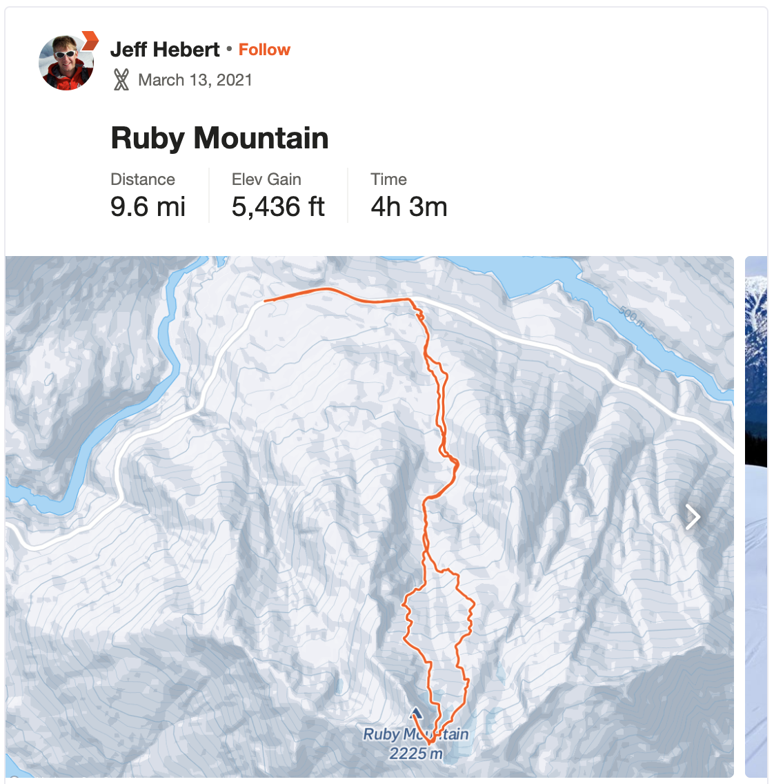 The ski out from here was pretty heinous. Recent winds had caused tree branches and needles to fall everywhere and the snow coverage was high enough to want to ski vs. walk, but low enough that slide alder was poking through everywhere. The snow was also classic, low-elevation spring concrete. We survival skied our way down, eventually hitting the forest road, which went up and was flat enough that we got quite a final arm and ab workout, not wanting to transition one more time. The descent took much longer than we’d hoped, but we still made it to the car in under 12 hours.